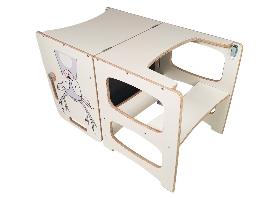 K věži doporučujeme dokoupit ladící malou stoličku, na kterou si může sednout rodič, když je věž rozložená na stoleček a hrát si s dítkem nebo ho krmit.